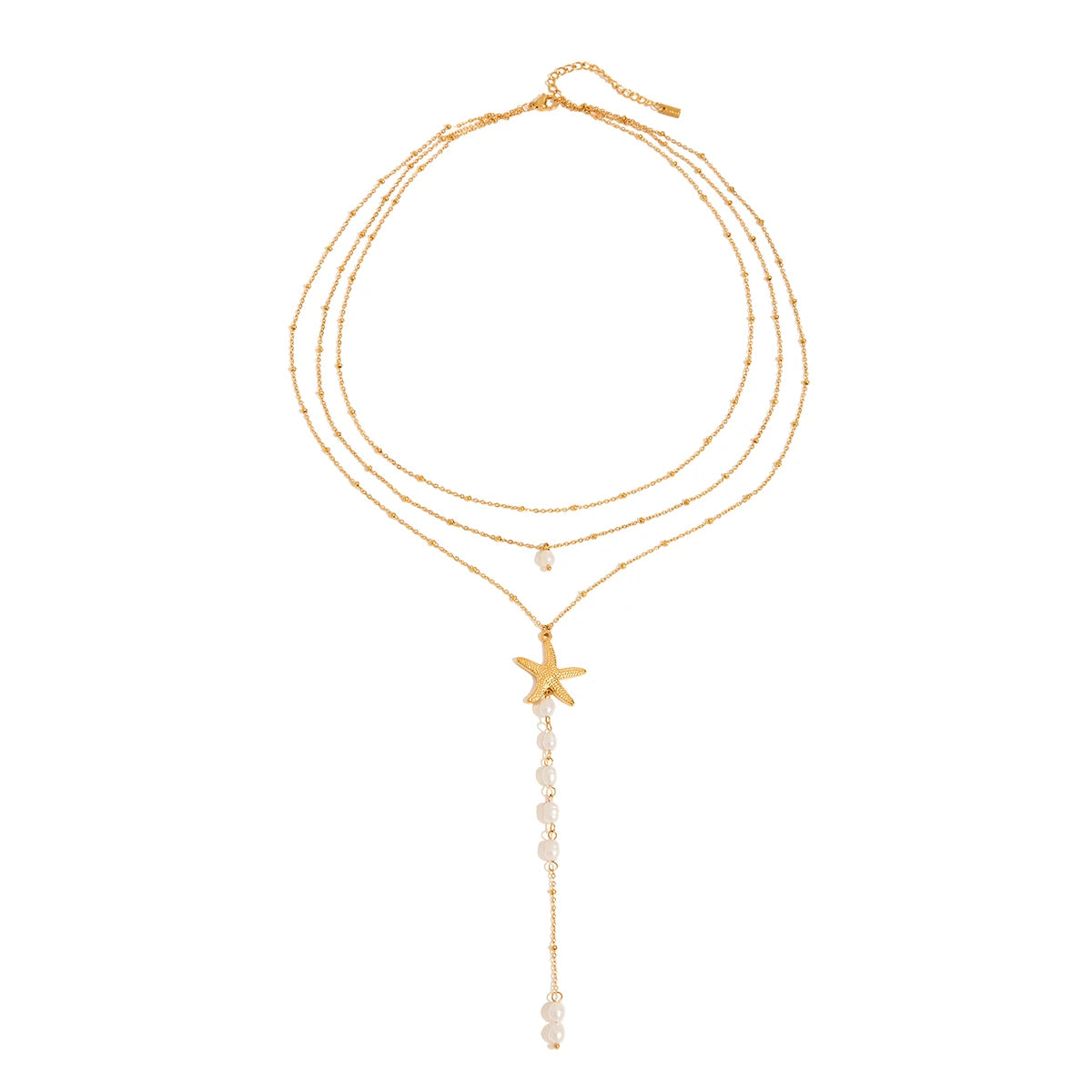 Coral Pearl, A stunning three-layered necklace featuring a delicate Y-shaped third layer adorned with a charming starfish and three shimmering baby pearls. Perfect for adding a touch of ocean-inspired elegance to any outfit. Crafted with care to brighten your everyday style or complete your beachside look.